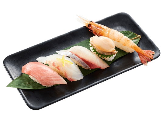 『かっぱの極み贅沢にぎり~秋の五貫~』【200円(税込)お得】1,340円(税込)~⇒1,140円(税込)~みなみ鮪中とろ、大切り活〆真鯛柚子塩、活〆はまちはらみ、大切り蝦夷あわび、ぼたん海老(店内殻剥き)※店内飲食限定
