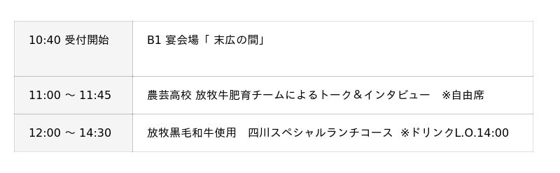 「農芸高校が“放牧肥育”で目指す、未来につなげる新しい畜産のカタチ」京都府立農芸高校で放牧黒毛和牛の肥育に携わった生徒たちが登壇し、新たな肥育方法への挑戦や、そこで得た学び、牛を育てる中で感じた想いを語ります。彼らの声を通して、“未来の食のあり方”を共に考えるきっかけとなるイベントです。その後は、中国料理「四川」にて、生徒が実際に育てた放牧黒毛和牛を使った、この日だけのスペシャルランチコースをお楽しみいただきます。(先着50名様)