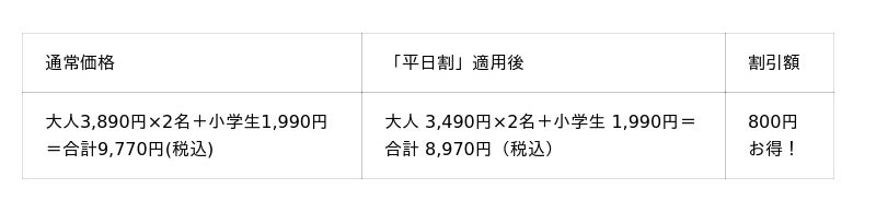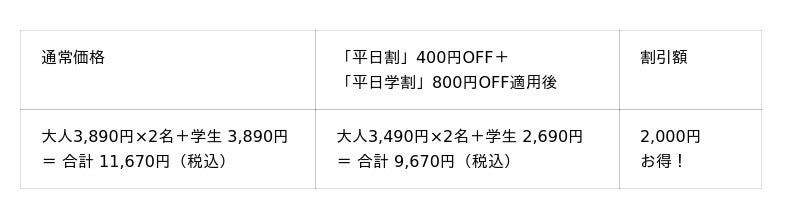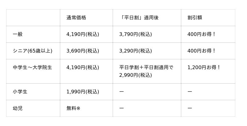 ※「平日割」の対象は一般・シニア料金のお客様です。※「平日割」・「平日学割」はキャンペーン開催期間中の土日・祝を除く平日のみが割引適用となります。※幼児は保護者1名様につき幼児2名様まで。3名様以上は1名様につき990円(税込)頂戴いたします。※学割は学生証ご提示の本人に限り有効です。